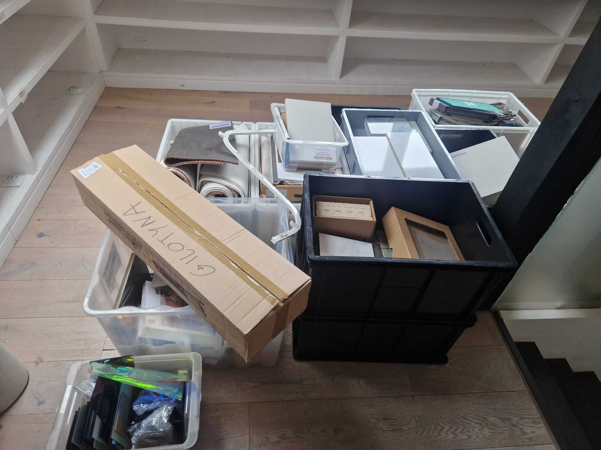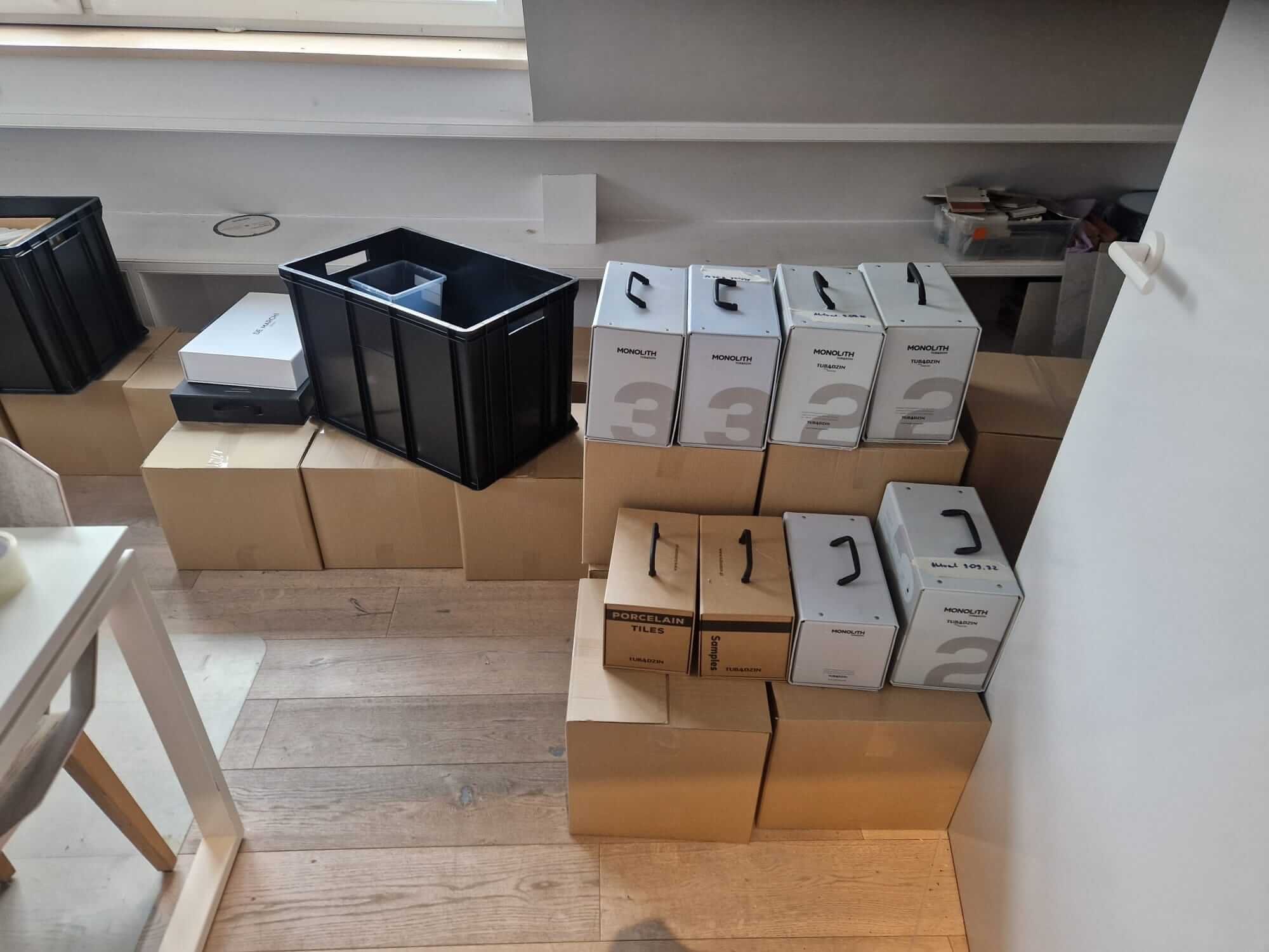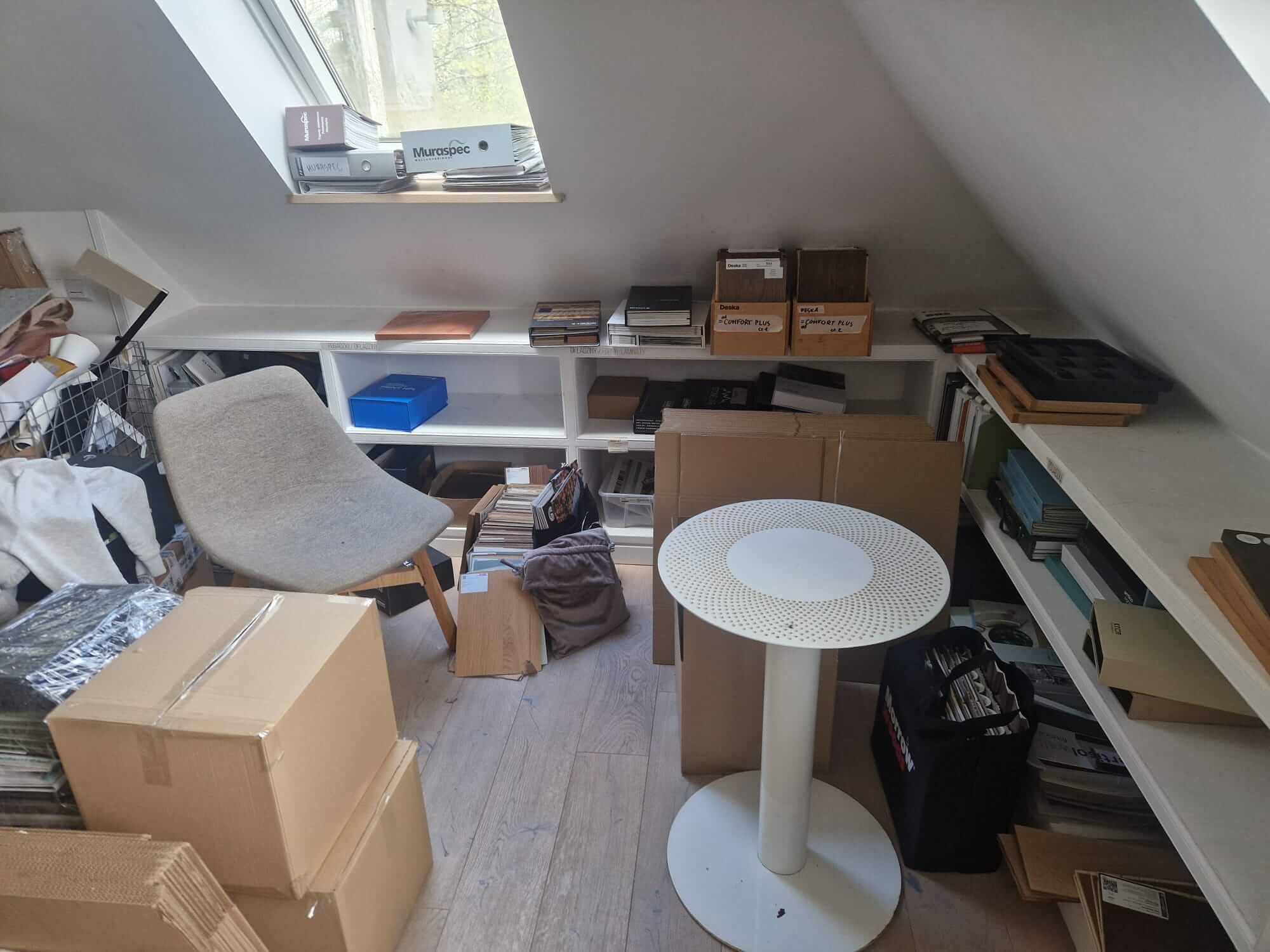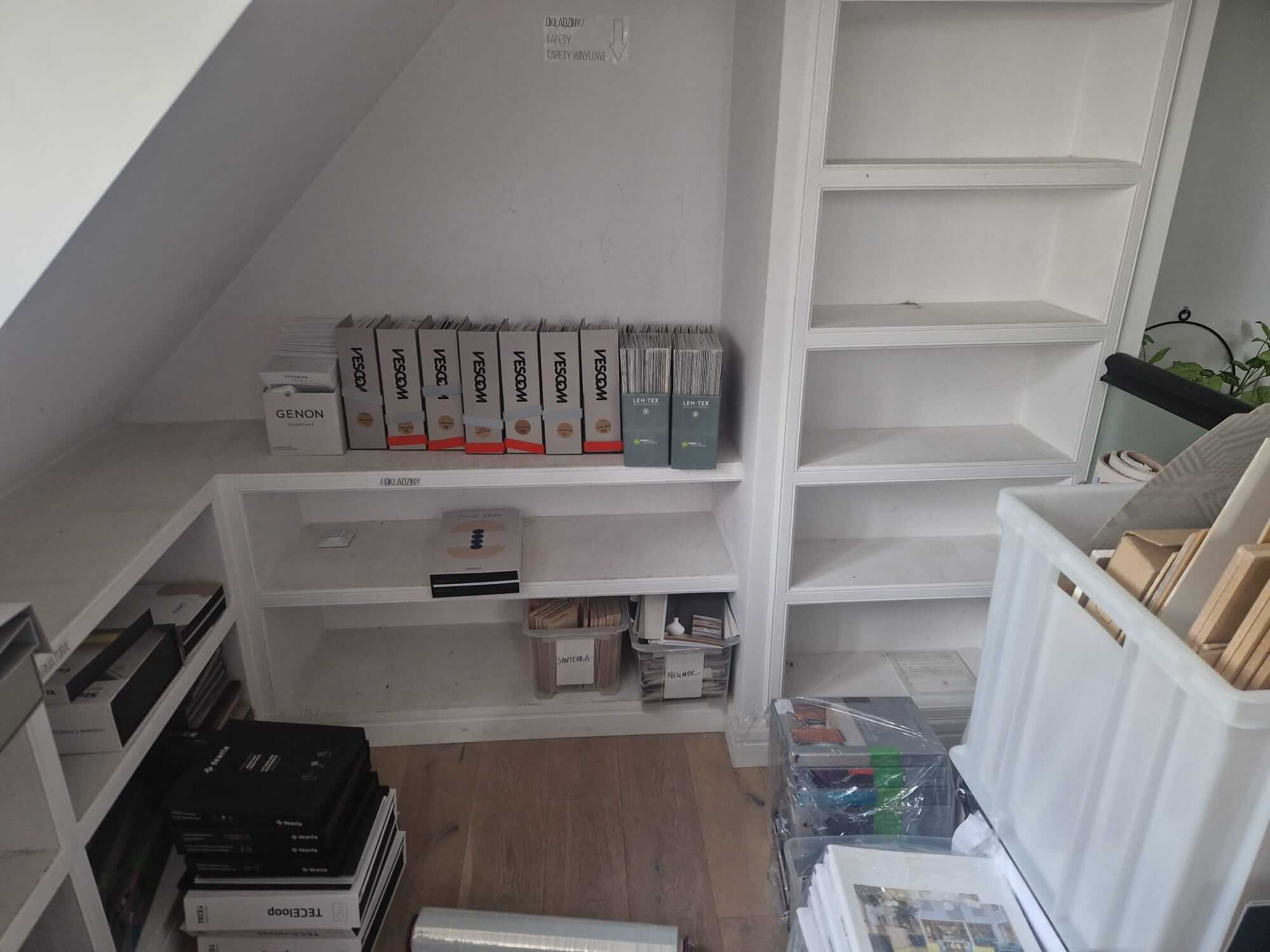 Większość przeprowadzek biurowych to stoły, krzesła, monitory i kartony z dokumentami. Tutaj sprawa wyglądała inaczej. Studio zajmowało się projektowaniem wnętrz, co oznaczało dziesiątki segregatorów i próbników materiałów, katalogi formatów A2 i większych, płytki ceramiczne spakowane w designerskie opakowania, drobne elementy dekoracyjne i sprzęt komputerowy z kilkoma stanowiskami roboczymi.