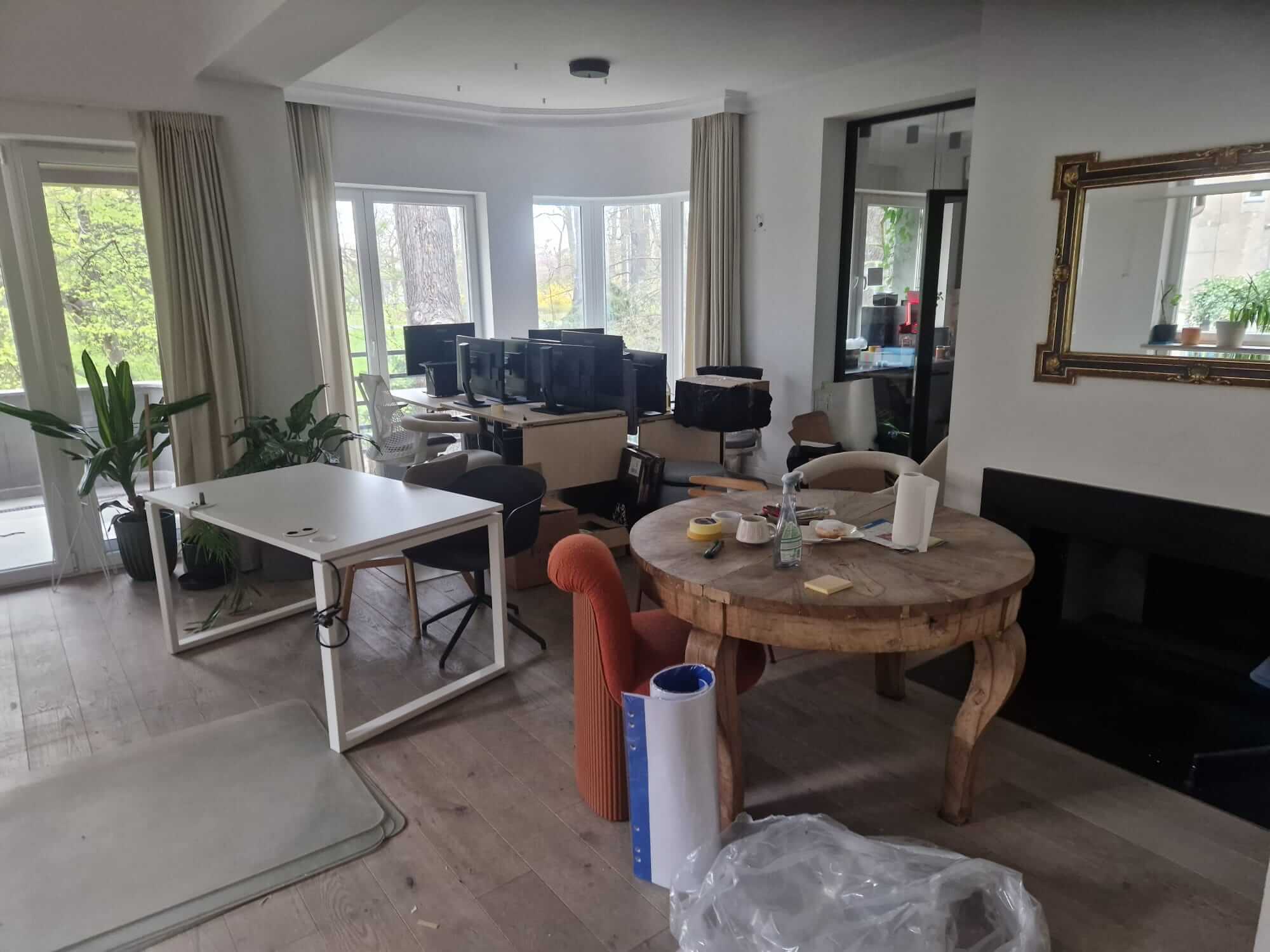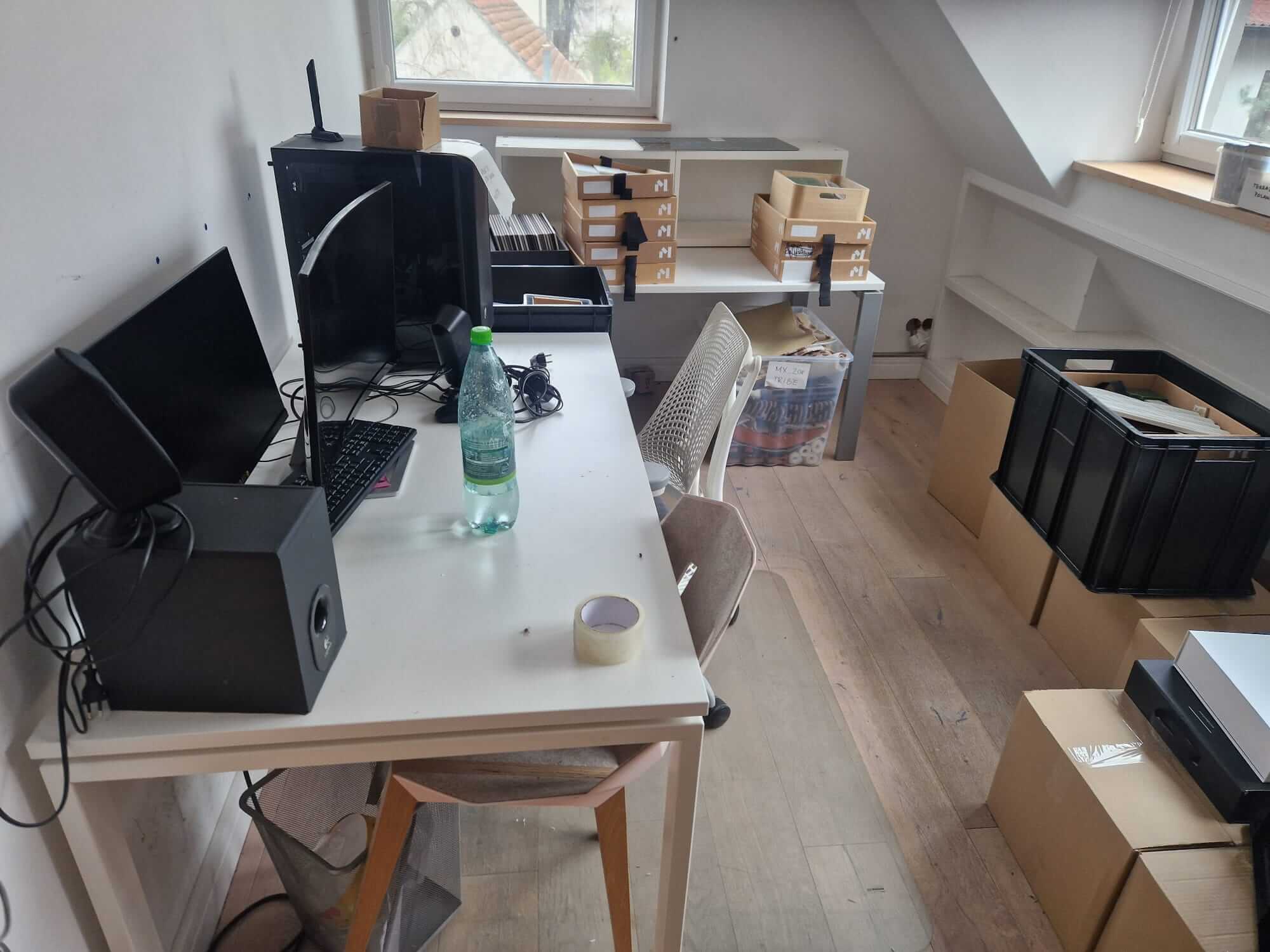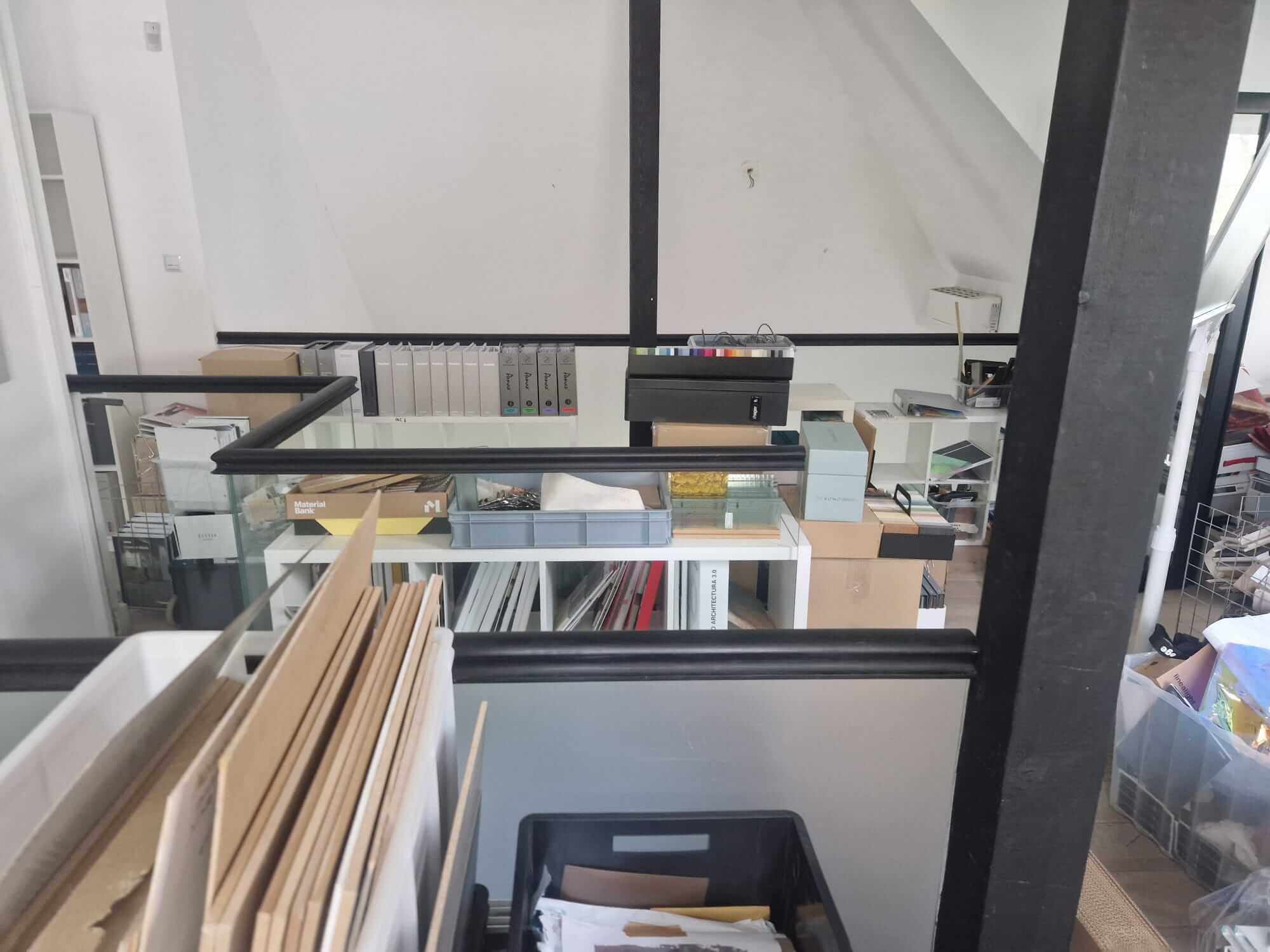 Do tego doszło wyzwanie lokalizacyjne — biuro mieściło się w budynku z antresolą. Część rzeczy stała na górze, część na dole, a dostęp do każdego z poziomów wymagał osobnej trasy. Zanim ekipa w ogóle zaczęła pakować, trzeba było zaplanować kolejność wynoszenia tak, żeby nie zapchać wąskich przejść.